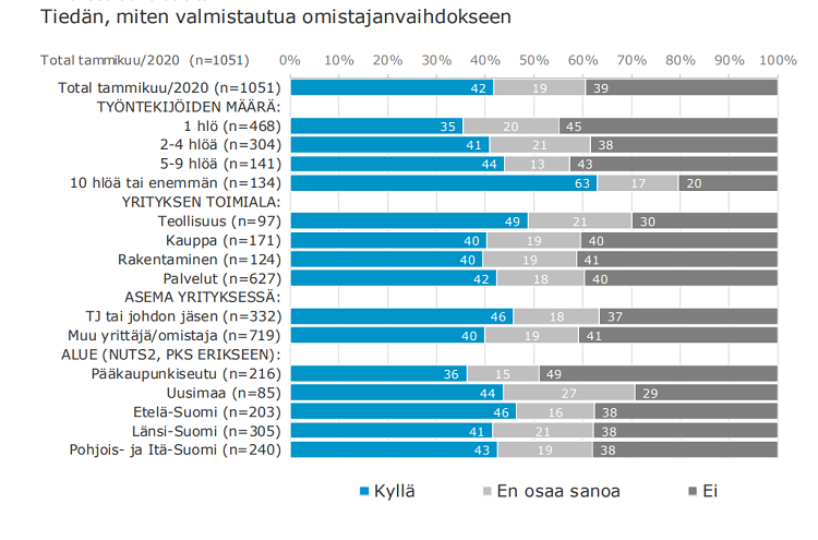 42 prosenttia vastaajista kertoi tietävänsä, miten omistajanvaihdokseen pitää valmistautua. Työnantajayrittäjistä tietoa oli 47 prosentilla, yksinyrittäjistä vain 35 prosentilla.