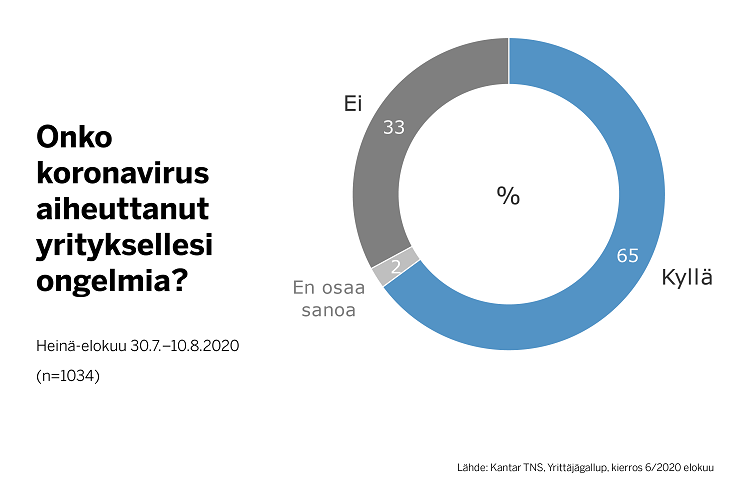 Yritysten tilanne on parantunut kesän aikana laajalla rintamalla. Tämä näkyy hyvin Kantar TNS:n Suomen Yrittäjien pyynnöstä tekemän kyselyn tuloksissa eri näkökulmista. Nyt 65 prosenttia yrityksistä kertoo kärsineensä koronakriisistä, kun toukokuussa näin vastasi 73 ja huhtikuussa 76 prosenttia yrityksistä.