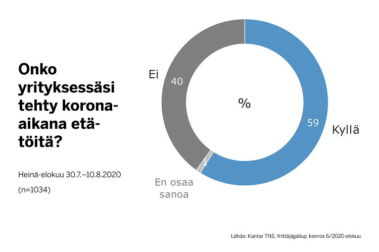 59 prosentissa yrityksistä on tehty koronakriisin aikana etätöitä.