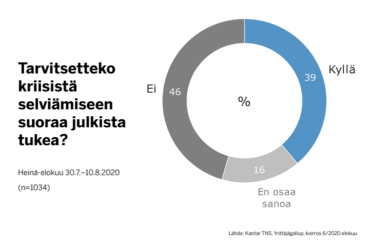 39 prosenttia yrityksistä kertoo tarvitsevansa suoraa tukea. Kriisin alkuvaiheissa näin vastasi 48 prosenttia.