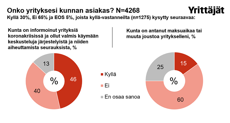 Suomen Yrittäjät kysyi yrittäjiltä yrityksen ja kotikunnan suhteesta laajassa Yrittäjän kuntabarometri -kyselyssä. Kysely avattiin ennen koronakriisin puhkeamista, mutta kriisin iskettyä kyselyyn lisättiin kysymyksiä kriisistä. Koronakysymyksiin ehdittiin saada 4268 vastausta. Kaikki kuntabarometrin tulokset julkistetaan 9.6.