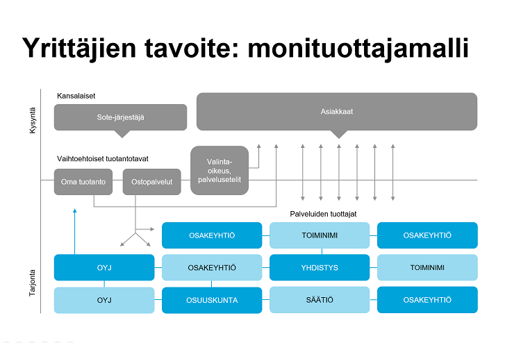 Myönteistä on, että sote-maakuntien on laadittava palvelustrategia. Yrittäjät on tätä esittänyt, ja palvelustrategiassa pitää olla pk-yrittäjyydelle sija. Se tarkoittaa esimerkiksi sitä, että asiakkaille pitää antaa subjektiivinen oikeus palveluseteliin. Tämä oikeus pitää kirjata soten järjestämislakiin. Kun asiakas voi valita, syntyy monituottajamalli: