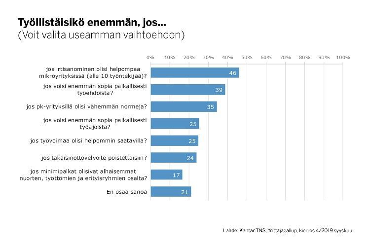 Yrittäjät ovat valmiit työllistämään enemmän, jos työmarkkinoita uudistetaan rohkeasti. Yrittäjät kertovat työllistävänsä enemmän, jos irtisanominen olisi mikroyrityksissä helpompaa (46 %), työehdoista voisi sopia enemmän paikallisesti (39 %) ja pk-yrityksillä olisi vähemmän normeja (35 %). Tiedot ilmenevät Yrittäjägallupista. Suomen Yrittäjien liittokokous vaatiikin vaikuttavia uudistuksia työmarkkinoille.