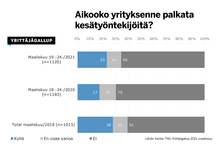 Viime vuonna 17 prosenttia yrityksistä tarjosi kesätöitä, nyt 23 prosenttia kertoo tekevänsä niin. Se tarkoittaisi noin 78 000 kesätyöpaikkaa, jos suunnitelmat toteutuvat siten, kun yrittäjät nyt arvioivat. Määrä on korkea tilanteen epävarmuus huomioon ottaen.