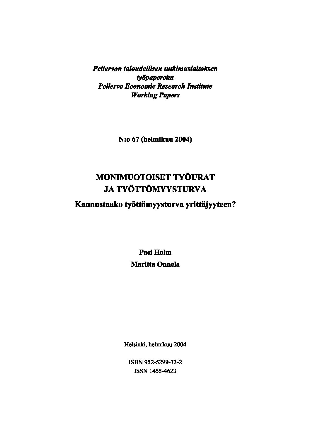 1.2.2004 Kannustaako työttömyysturva yrittäjyyteen? Tutkimuksessa tarkastellaan työttömyysturvan määräytymistä sellaisissa monimuotoisissa työurissa, joissa palkkatyö, yrittäjyys ja työttömyys vuorottelevat. Monimuotoisten työurien työttömyysturvan…