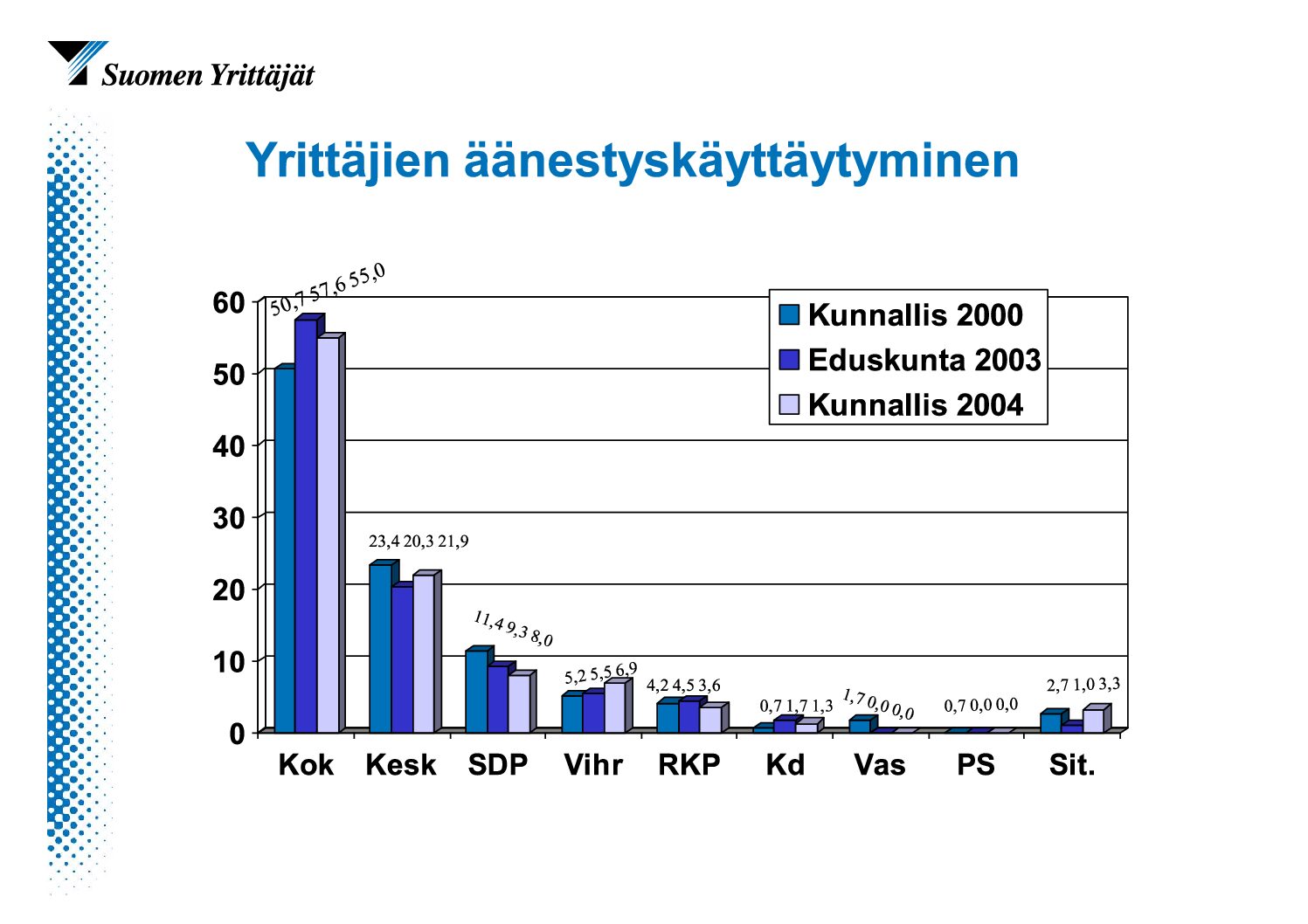 31.12.2004 Yrittäjien äänestyskäyttäytymistä kunnallisvaaleissa 2000 ja eduskuntavaaleissa 2003 sekä ennusteita äänestyskäyttäytymisestä kunnallisvaaleissa 2004 esitetään oheisessa liitetiedostossa. >> Kannatuskuviot