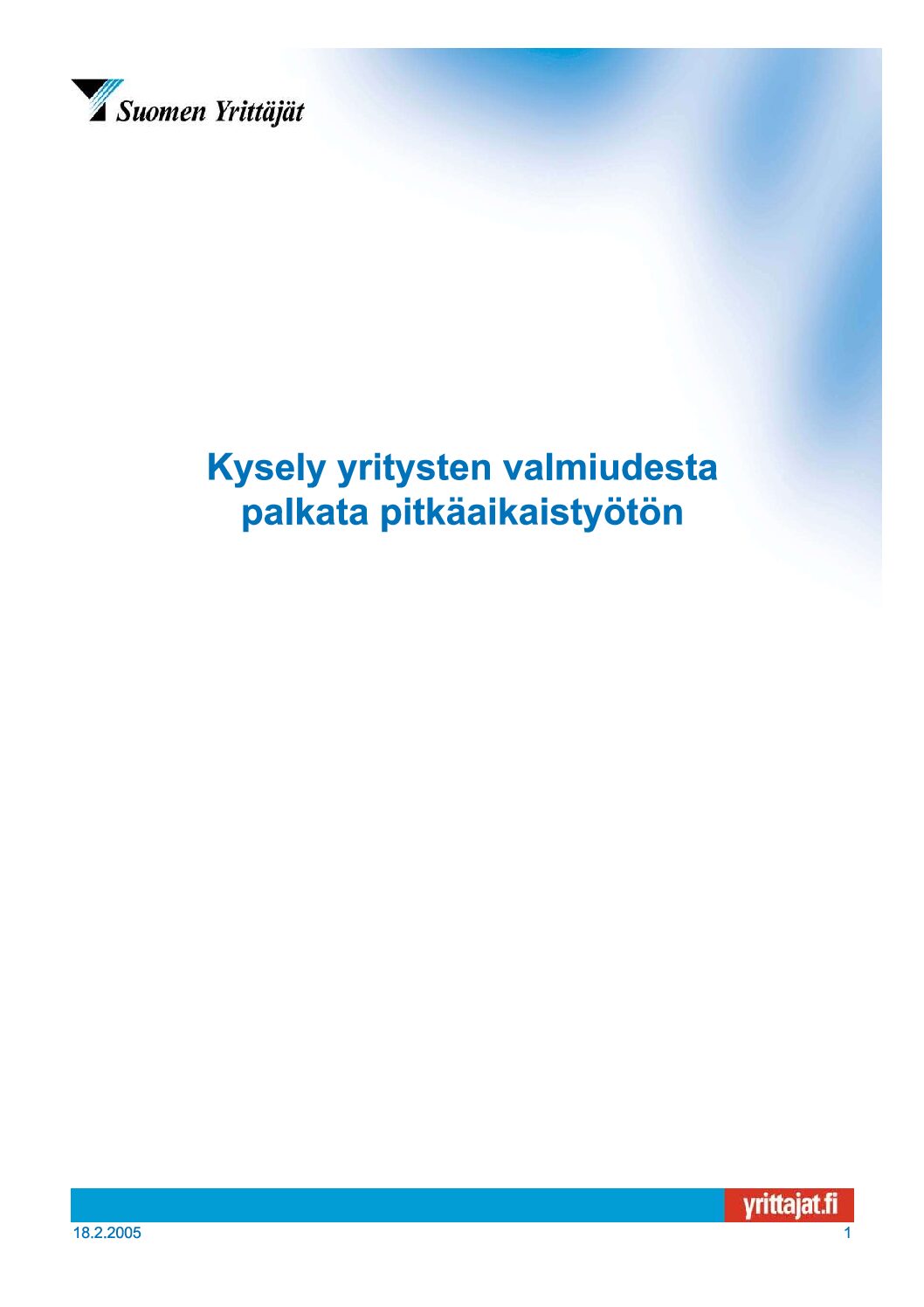 18.2.2005 Yhteenveto Yrityksiltä kysyttiin eri toimenpiteiden vaikuttavuudesta pitkäaikaistyöttömien työllistämiseksi. Kyselyn tärkeimmät tulokset olivat seuraavat: ¾ vastaajista olisi valmis palkkaamaan pitkäaikaistyöttömän,…