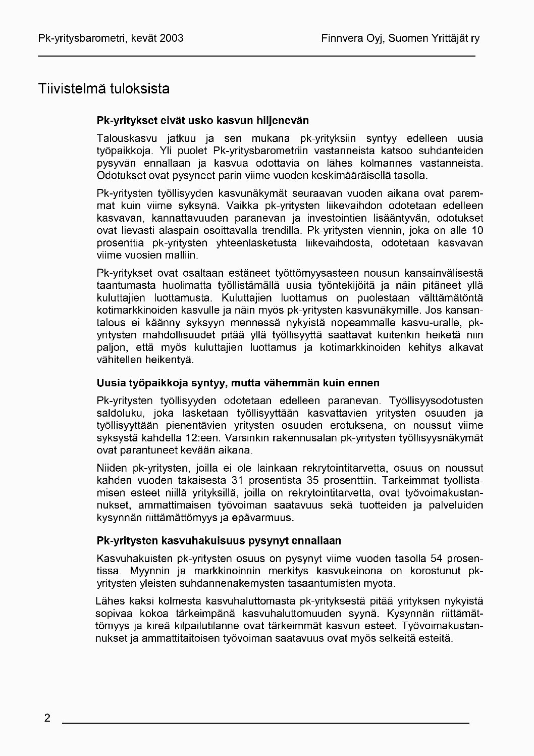 1.3.2003 Tiivistelmä tuloksista Pk-yritykset eivät usko kasvun hiljenevän Talouskasvu jatkuu ja sen mukana pk-yrityksiin syntyy edelleen uusia työpaikkoja. Yli puolet…