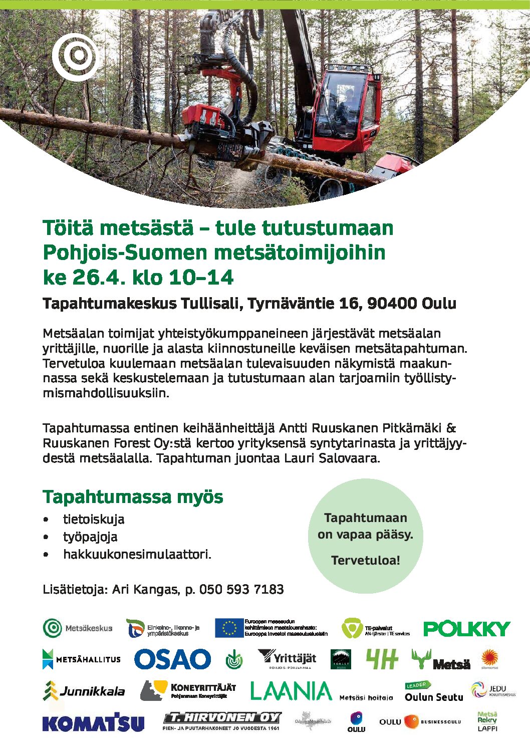 Tapahtumaan on vapaa pääsy, ei ilmoittautumista.10.00 Tapahtuman avaus10.15 Metsäalan tulevaisuuden näkymät maakunnassa, yhteysjohtaja Arto Sorri, Suomen metsäkeskusKommenttipuheenvuorot Laania Oy, Stora…