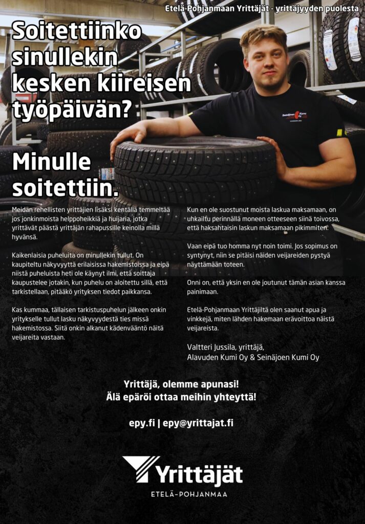 Me täällä Etelä-Pohjanmaan Yrittäjissä autamme jäseniämme vääntämään kättä näitä veijareita vastaan. Kenenkään ei pidä nieleskellä ja pitää kättä nyrkissä taskussa, vaan rohkeasti pyytää apua, jos tuntuu, ettei itse pärjää.