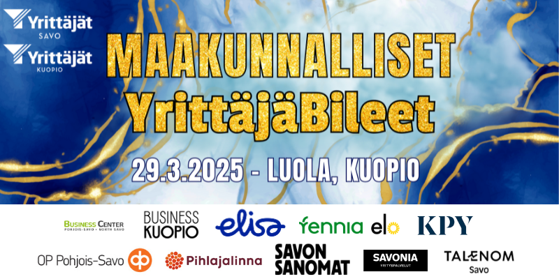 Juhlaa mahdollistamassa upeat pääyhteistyökumppanimme Business Kuopio, Elisa, Fennia, Elo, KPY, OP Pohjois-Savo, Pihlajalinna, Ropo, Savon Media, Savonia Yrityspalvelut & Business Center Pohjois-Savo sekä Talenom.