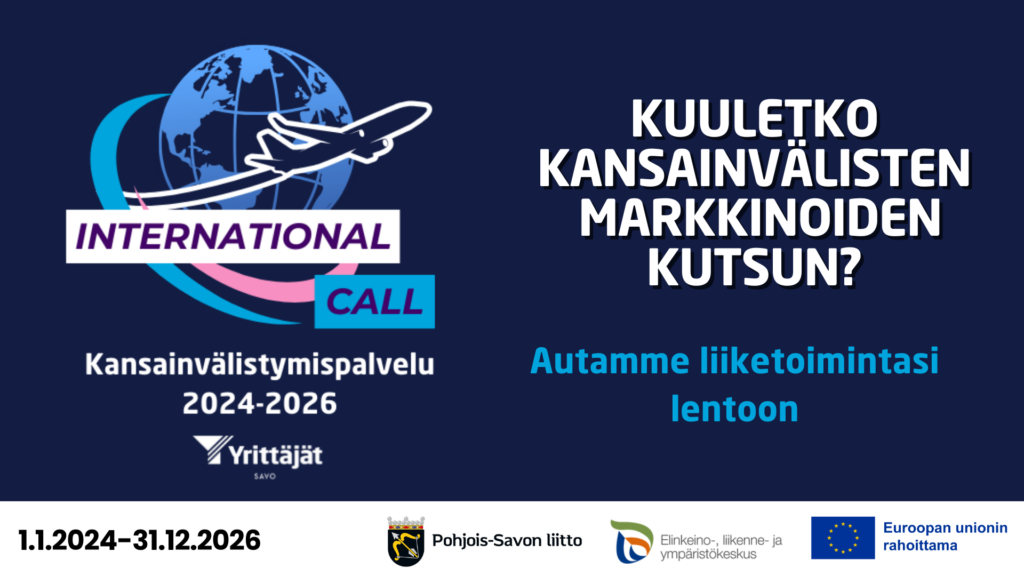 International Call on Savon Yrittäjien hallinnoima kansainvälistymispalvelu 2024-2026, jossa sparrataan pohjoissavolaisia pk-yrityksiä kv-markkinoille. Valmennusosioiden lisäksi palveluun kuuluu kaksi markkina-avausmatkaa – ensimmäinen Pohjois-Ruotsiin 2025 ja toinen Puolaan 2026.