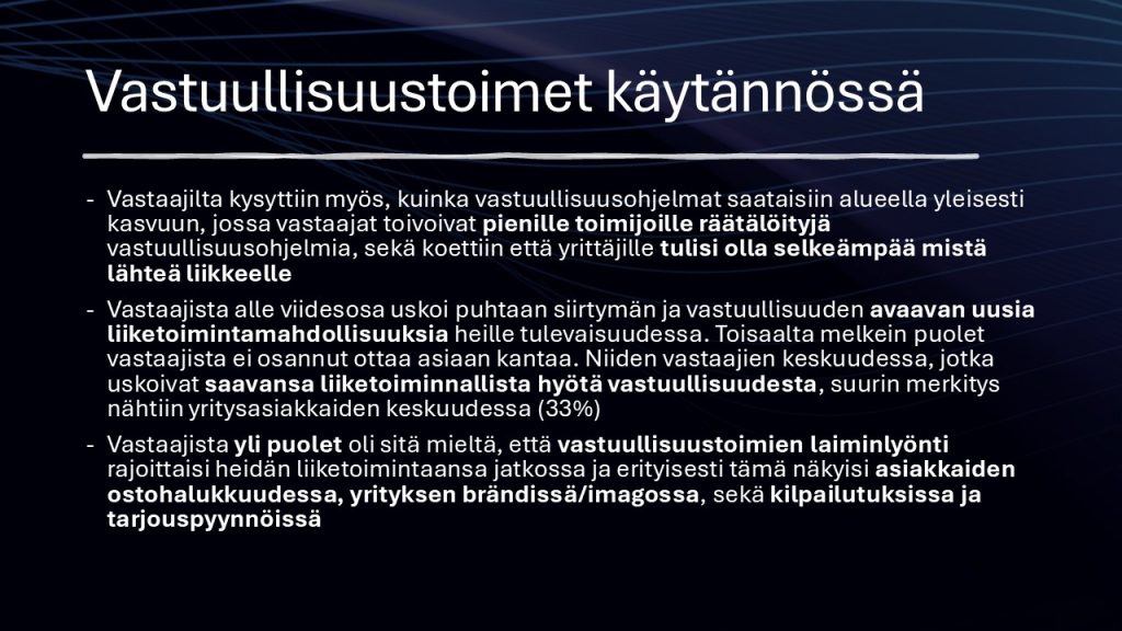 -Avoimien vastausten perusteella alueen yritysten parissa vastuullisuuteen liittyvät asiat vaikuttavat olevan ainakin jossain määrin tuttuja, mutta näistä saatava liiketoiminnallista hyötyä ei välttämättä täysin tunnisteta