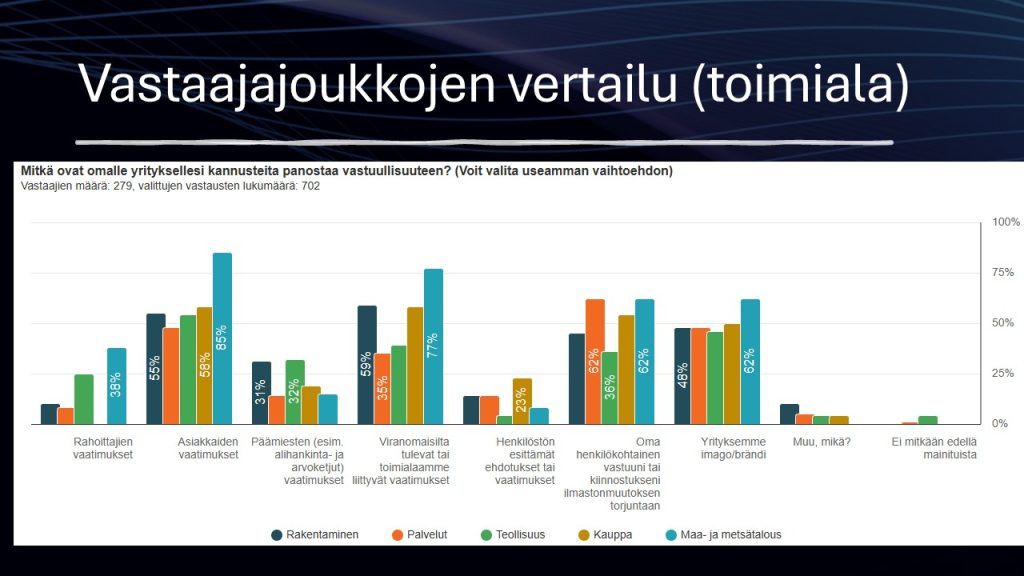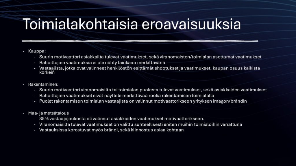 Kestävyyttä kohti – selvitystyön ensimmäisen yrityskyselyn vastausten perusteella on tullut selkeästi ilmi, että yrityksiin vaikuttavat myös ulkopuolelta tulevat paineet ja varsinkin yritysasiakkaiden keskuudessa vastuullisuutta myös vaaditaan toimittajilta. Syventäessä vastauksia toimialakohtaisesti, eroja on löydettävissä myös eri vastuullisuustyön motivaattorien suhteen.