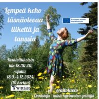 Keskiviikkoisin 18.30-20.00 Haapalehdon päiväkodin liikuntasalissa 18.9-4.12.2024 10x Lempeä keho- läsnäolevaa liikettä ja tanssia Lempeyttä ja läsnäoloa liikkeen ja tanssin avulla.Tanssi-liiketerapeuttisten…