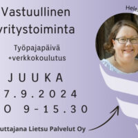 Tervetuloa mukaan keskustelemaan, oppimaan ja kehittämään juuri teidän yrityksenne vaikutuksia yhteiskunnallisina toimijoina, ympäristövaikuttajina, sekä sosiaalisen vastuun kantajina. Työpajapäivä Juuassa 17.9.2024…
