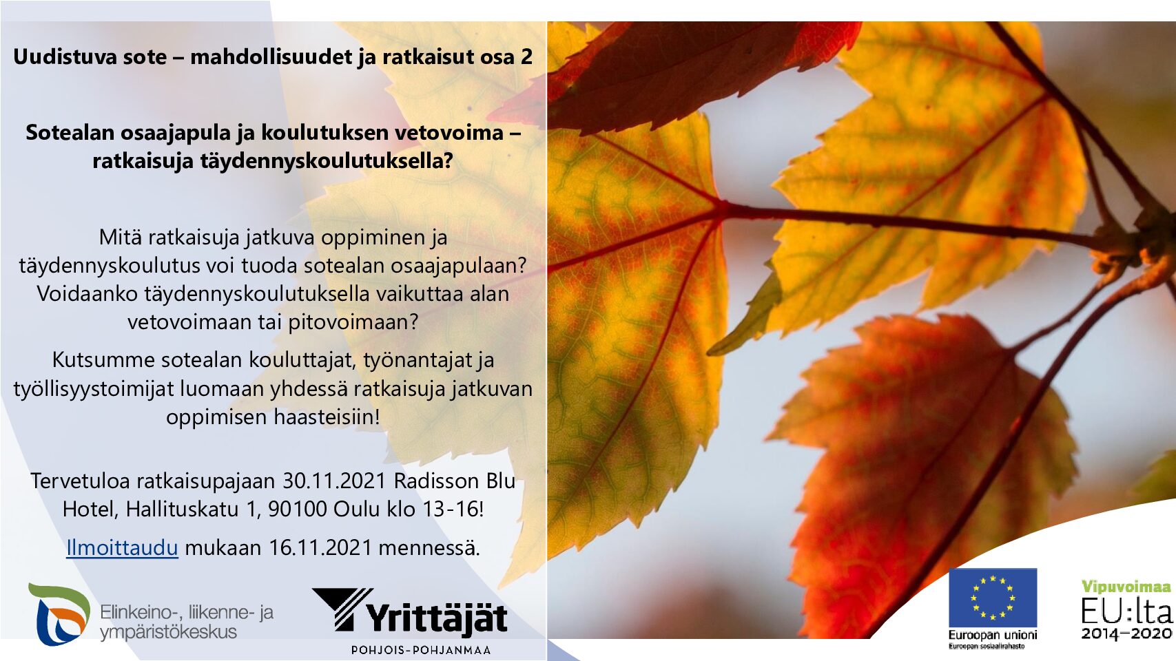 Sotealan osaajapula ja koulutuksen vetovoima – ratkaisuja täydennyskoulutuksella? Mitä ratkaisuja jatkuva oppiminen ja täydennyskoulutus voi tuoda sotealan osaajapulaan? Voidaanko täydennyskoulutuksella…