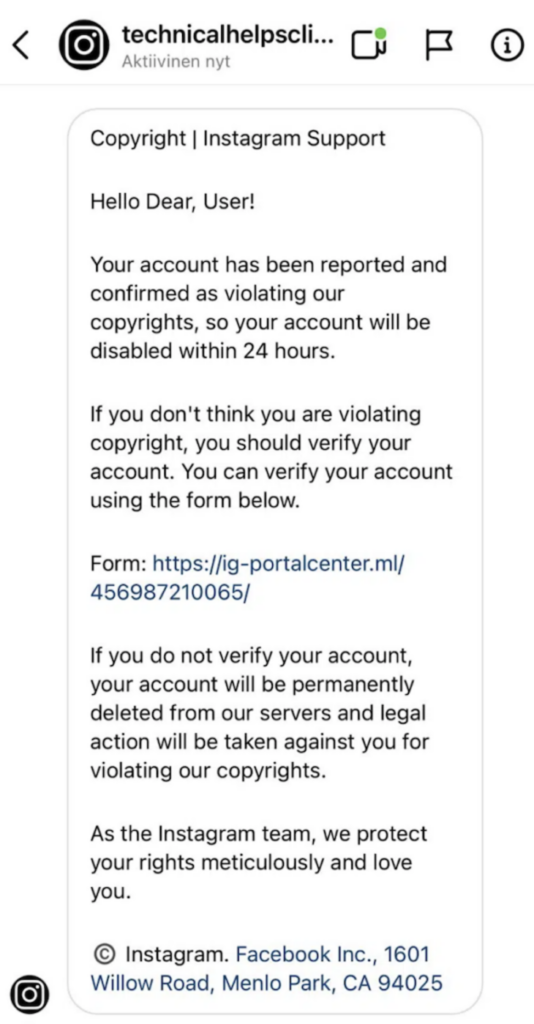The Instagram account of the You Name It Oy company was hacked last June. The business received a scam message claiming to come from Instagram support. The message said the company had committed copyright violations and asked the business to verify its Instagram account. You Name It Oy sells personalized gift items.