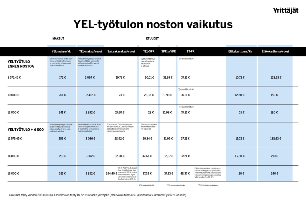 Yrittajat.fi calculated how a €4,000 increase in YEL income affects YEL premiums, social security and accrual of pension. The calculation was made for a business owner aged between 18 and 52.