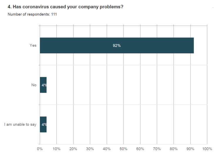 In terms of sales, 34% said sales had halved, 21% said sales had dropped by 10–30% and 20% said sales had dropped by 30–50%. Sales had dried up completely for 20% of respondents. A mere seven per cent believed their turnover would increase in the next two weeks.