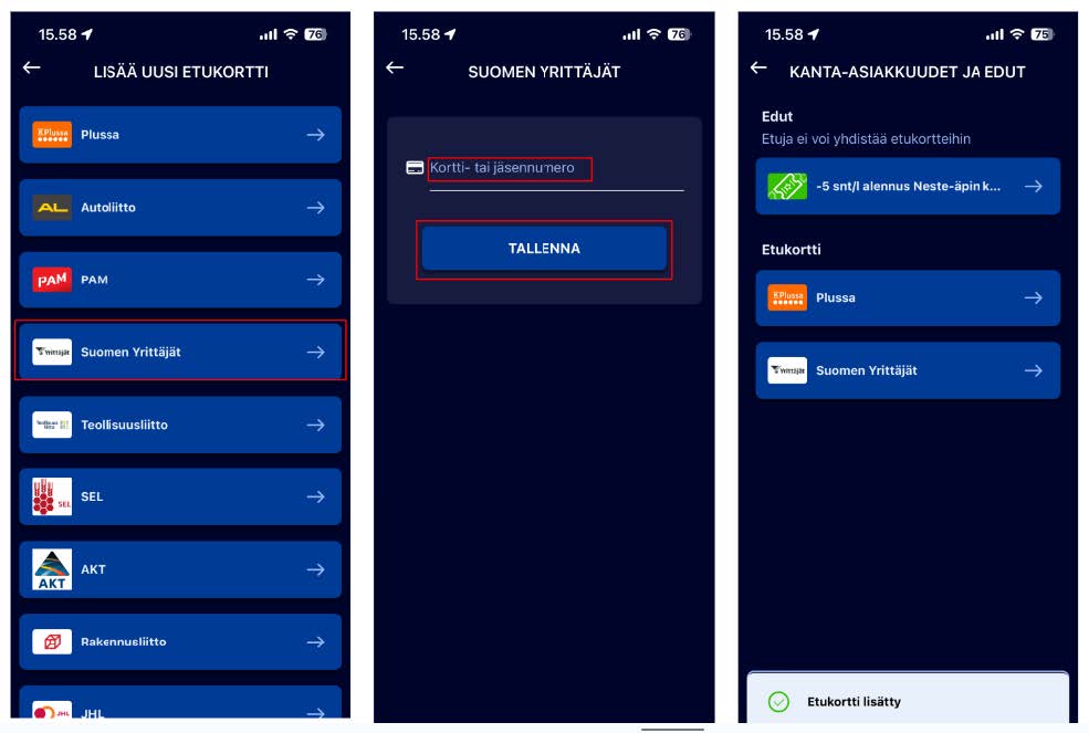 - Paina Lisää uusi etukortti ja valitse Suomen Yrittäjät