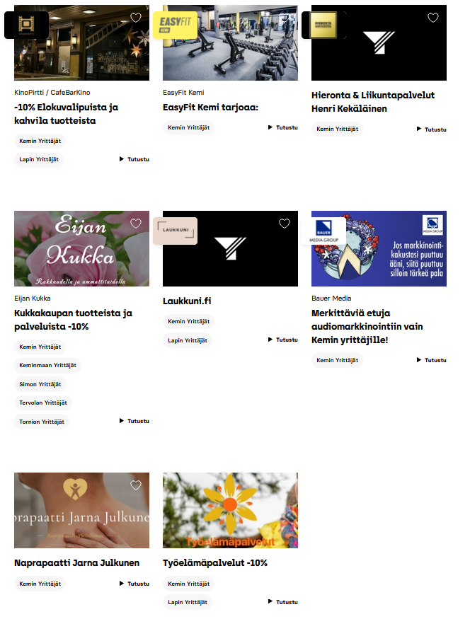Jäsen yrityksemme tarjoaa etuja seuraavasti; Klikkaa yritystä tarkastellaksesi tarkemmin tarjouksia: