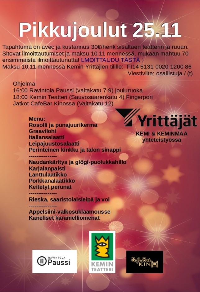 Jouluruokatarjoilut Paussissa sekä teatteri esitys Kemin Teatterissa. Tapahtumalla saatiin liikkeelle yhteensä 57henk josta suurin osa oli Kemin yrittäjien jäseniä. Tapahtumaan kutsuttiin kaikki Meri-Lapin alueen paikallisyhdistykset, mukaan kuitenkin osallistui vain Keminmaan Yrittäjät tällä kertaa.