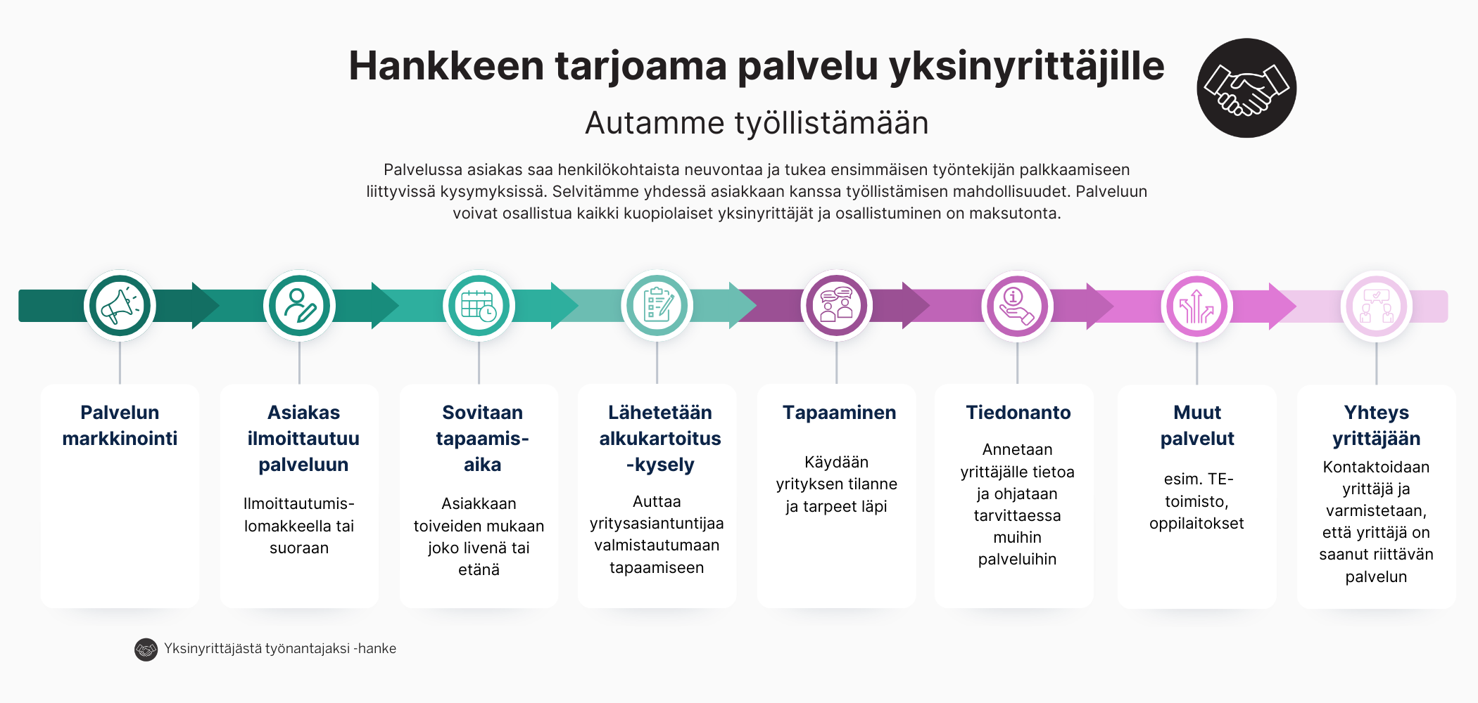 Ensimmäisen työntekijän palkkaaminen on yksi yrittäjän uran merkittävimmistä päätöksistä. Siksi on tärkeää, että rekrytoinnin taustaksi ja tueksi on saatavilla tietoa työnantajuudesta ja tukea työllistämisen jälkeenkin. Palvelun aikana