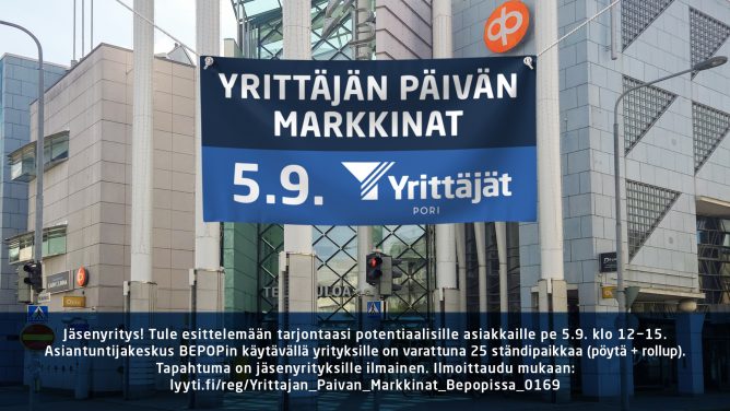 Porin Yrittäjät järjestävat valtakunnallisen Yrittäjänpäivän kunniaksi Yrittäjänpäivän markkinat Asiantuntijakeskus BEPOPin käytävällä pe 5.9.2025 klo 12–15. Yli 20 Porin Yrittäjien jäsenyritystä mukana esittelemässä tuotteitaan tai palveluitaan. Markkinoilla…