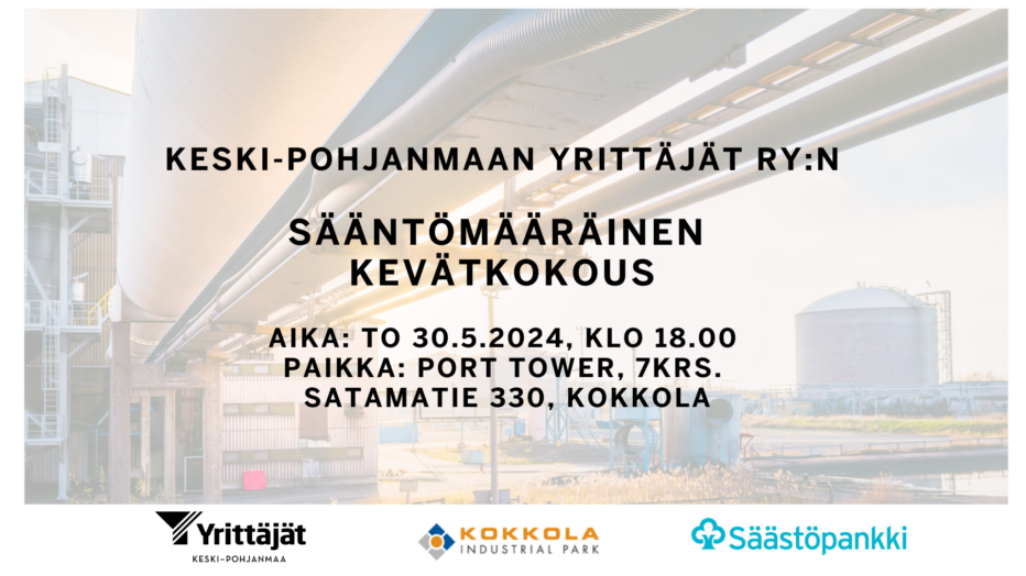 Mellersta Österbottens Företagare rf.s stadgeenliga vårmöte hålls to 30.5.2024, klo 18.00, vid Port Tower (7 våning), Karleby.