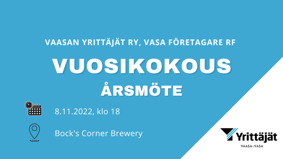 Välkommen på Vasa Företagare rfs årsmöte tisdagen 8.11.2022 till Bocks Corners mötesutrymme Ladan (Gerbyvägen 18) kl. 18.00.