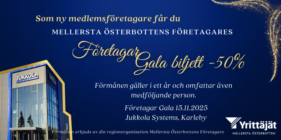Som nu medlem får du 50% rabatt på biljetten till Mellersta Österbottens Företagares Företagargala.