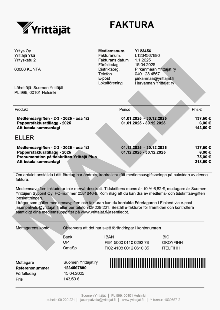 Misstänker du att du fått en faktura som är en bluff? En faktura som beställts per e-post kommer från adressen noreply@ropo.com. Nedan ser du en modell för medlemsfakturan 2025 som Företagarna i Finland skickar.