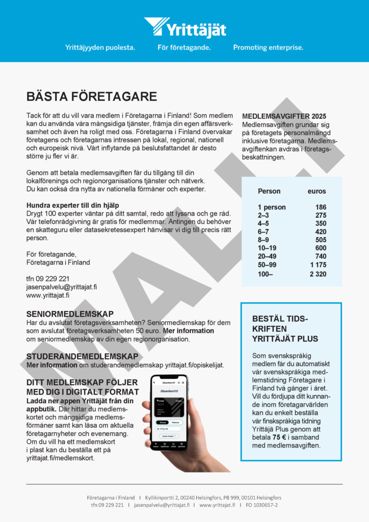 Medlemsavgiften innehåller inte mervärdesskatt. Priset på tidningen Yrittäjä Plus innehåller mervärdesskatt. Företagarna i Finland redovisar tidningsavgiften till Sypoint Oy. Om du inte vill prenumerera på tidningen, kan du betala bara medlemsavgiften. På så sätt registreras inte en prenumeration på tidningen.