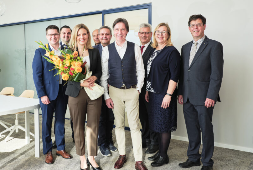 Christina Båssar, kommundirektör i Korsnäs, finns bland de första som gratulerar Dermoshops representanter till den nya bedriften. Båssar överräcker både en blombukett och ett bordsstandar, prydd med Korsnäs kommuns vapenmärke.