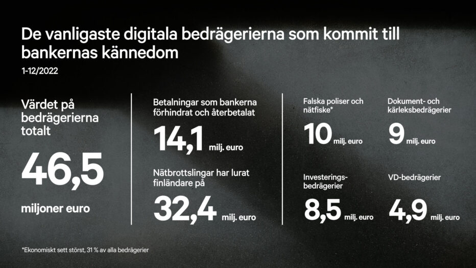 Finländare förlorade under 2022 sammanlagt 9 miljoner euro i så kallade dokumentbedrägerier och kärleksbedrägerier, 4,9 miljoner euro i vd-bedrägerier och 8,5 miljoner euro i investeringsbedrägerier. Bedrägerier av falska poliser och bedrägerier i form av nätfiske var penningmässigt de mest betydande bedrägerierna, och de uppgick till sammanlagt 10 miljoner euro. I den här typen av bedrägerier lurades finländare på nästan fyra gånger mer pengar under årets senare hälft än under årets första hälft. Även i samband med andra bedrägeriformer förlorades betydligt mer pengar under årets andra hälft.