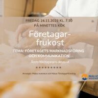 Företagarfrukost 24.11.2023 på Minettes kök. Frukost serveras från kl. 7.30 och programmet börjar kl. 8.00. Program: Aktuellt från Malax Företagare…
