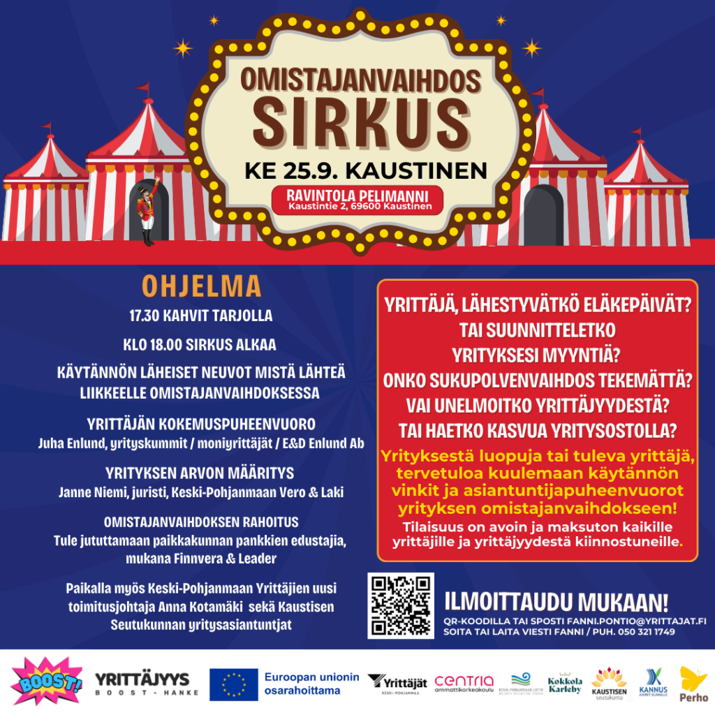 Tilaisuuden järjestää YrittäjyysBOOST-hanke, Keski-Pohjanmaan Yrittäjien ja Centria-ammattikorkeakoulun yhteishanke, jota rahoittaa Keski-Pohjanmaan Liitto yhdessä Kokkolan, Perhon, Kaustisen Seutukunnan ja Kannuksen kanssa. Hankeaika on 1.2.2024–31.12.2026, ja sen tapahtumat ovat avoimia kaikille yrittäjille! Tämä tilaisuus on toteutettu yhteistyössä Kaustisen Seutukunnan kanssa