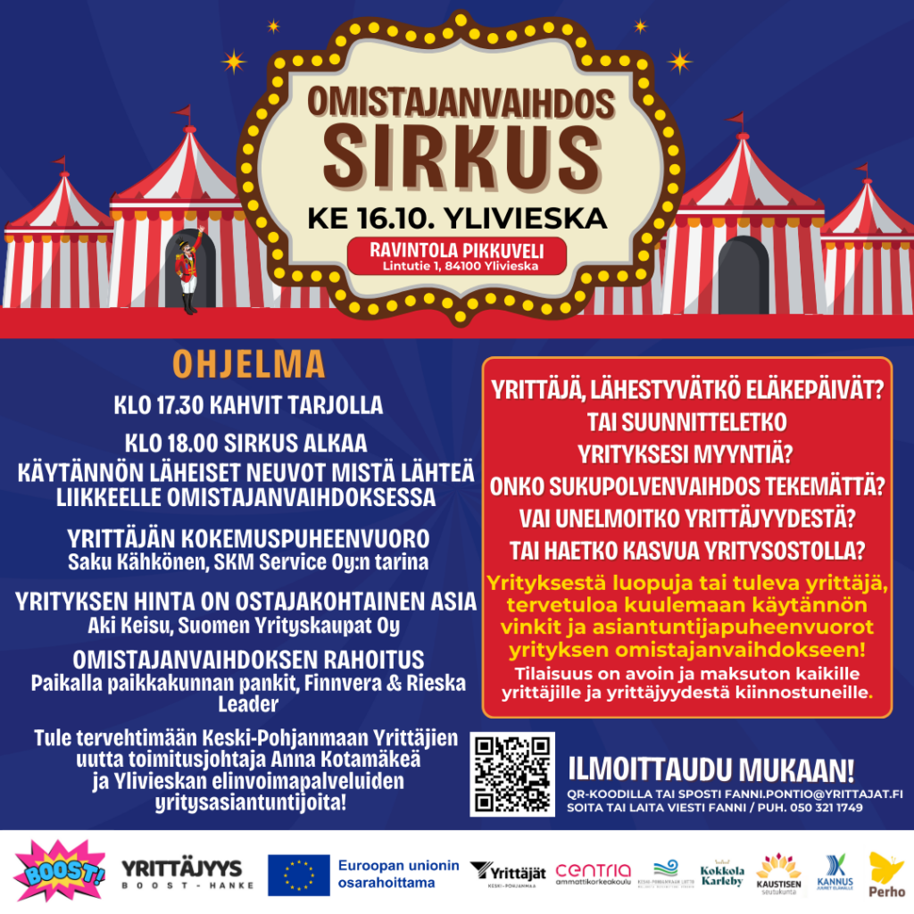 Tilaisuuden järjestää YrittäjyysBOOST-hanke, Keski-Pohjanmaan Yrittäjien ja Centria-ammattikorkeakoulun yhteishanke, jota rahoittaa Keski-Pohjanmaan Liitto yhdessä Kokkolan, Perhon, Kaustisen Seutukunnan ja Kannuksen kanssa. Hankeaika on 1.2.2024–31.12.2026, ja sen tapahtumat ovat avoimia kaikille yrittäjille! Tapahtuma on järjestetty yhteistyössä Ylivieskan Elinvoimapalveluiden kanssa.