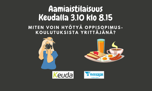 Keuda tarjoaa yrittäjille aamiaista maanantaiaamuna klo 8.15 alkaen. Samalla saat arvokasta informaatiota, kuinka voit hyödyntää oppisopimusta itsesi kouluttamiseen, mutta myös työntekijöiden kouluttamiseen.