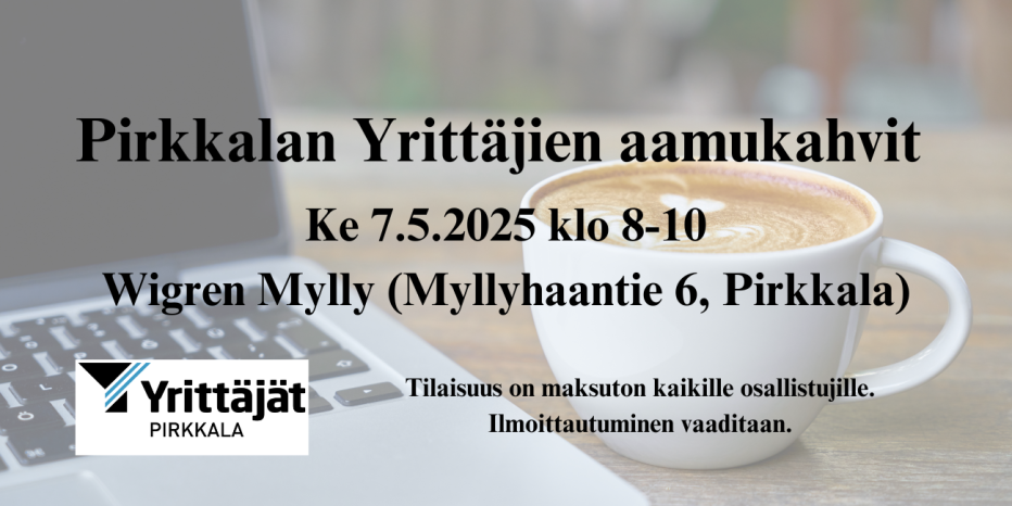 Tervetuloa Pirkkalan yrittäjien avoimeen aamiaistilaisuuteen nauttimaan Myllyn maukkaasta aamiaispöydästä, verkostoitumaan sekä kuulemaan yritysesittelyä ja yrittäjille ajankohtaisia asioita.