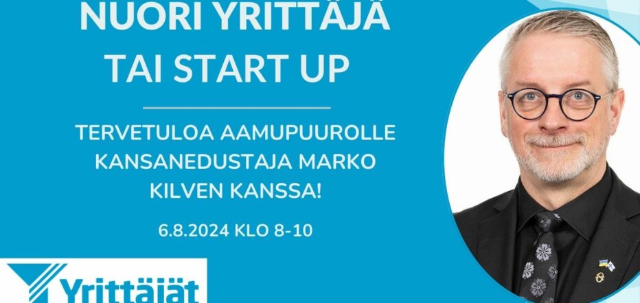 Kansanedustaja Marko Kilpi on tulossa vieraaksemme 6.8. Aloitamme päivän aamupuurolla, jossa keskustelemme erityisesti nuorten yrittäjien ja start up -yrittäjien kuulumisista ja ajatuksista yrittäjyyden alkutaipaleella.