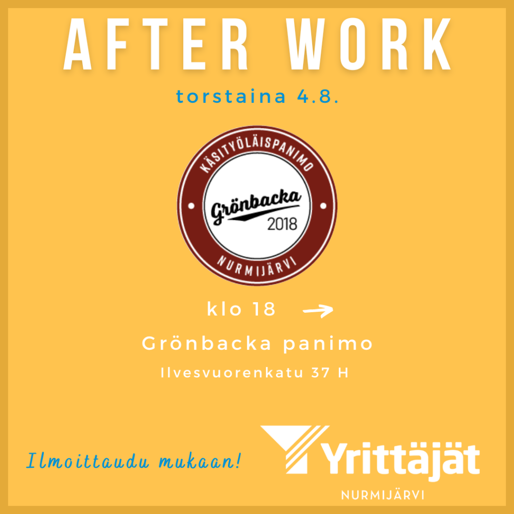 Tapahtuma After Works – Vierailu Grönbackan panimolle 4.8.2022 klo 18:00 – 19:30 Nurmijärvi Nurmijärven Yrittäjät Mennään tutustumaan Grönbackan panimoon ja maistelemaan heidän tuotteitaan klo 18 alkaen. Ilmoittaudu tästä mukaan { "name":"After Works – Vierailu Grönbackan panimolle", "description":"Linkki ilmoittautumiseen:\n[url]https://forms.office.com/Pages/ResponsePage.aspx?id=2h2l-5rtJEii2eVypwMrxzJyt7m_prBDhjxBldsX40BURThGMVRTOENYTFZVOFREMEFROEFRR0hIUy4u[/url]", "startDate":"2022-08-04", "startTime":"18:00", "endDate":"2022-08-04", "endTime":"19:30", "location":"Ilvesvuorenkatu 37 H 01900 Nurmijrvi", "label":"Lisää kalenteriin", "options":[ "Apple", "Google", "iCal", "Microsoft365", "MicrosoftTeams", "Outlook.com", "Yahoo" ], "inline":true, "listStyle":"modal", "trigger":"click", "timeZone":"Europe/Helsinki", "iCalFileName":"Yrittajat.fi - After Works – Vierailu Grönbackan panimolle" } Omakustanteinen Ilvesvuorenkatu 37 H, 01900 Nurmijärvi, Nurmijärvi Verkostoituminen Jaa Kopioitu leikepöydälle