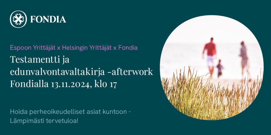 Espoon Yrittäjät X Helsingin Yrittäjät X Fondia järjestävät yhteistyössä maksuttoman afterwork -tapahtuman keskiviikkona 13.11. alkaen klo 17.00. Tule kuulemaan tärkeistä, kaikkia koskettavista aihealueista: testamentin laatiminen ja edunvalvontavaltakirjan laatiminen.