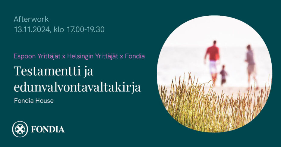 Helsingin Yrittäjät, Espoon Yrittäjät ja Fondia järjestävät yhdessä mielenkiintoisen Afterwork -tapahtuman, jossa pureudutaan testamenttiin ja edunvalvontavaltakirjaan. Lämpimästi tervetuloa!