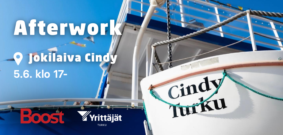 Kesäisenä afterwork-paikkana toimii tällä kertaa Jokilaiva Cindy! Aurinkoisella säällä istuskelemme ulkona, mutta mikäli sää vaatii, niin siirrymme sisätiloihin.