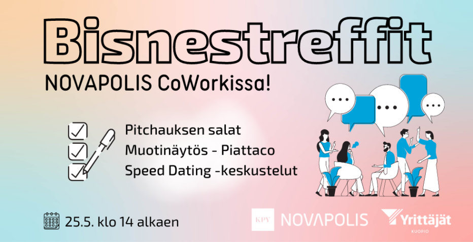 Tervetuloa yhteistyössä KPY Novapoliksen kanssa 25.5. järjestettäville Bisnestreffeille! Ohjelmassa myös pichausta Bisness Centerin Innovaatioasiantuntija Matti Laitisen johdolla sekä Piattacon kesämuotinäytös.