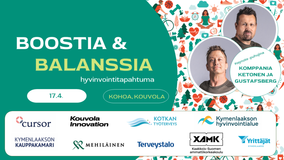Kymenlaakson kauppakamari, Cursor Oy, Kouvola Innovation Oy, Kymen Yrittäjät ja Kymenlaakson Hyvinvointialue järjestävät yhteistyössä Boostia & Balanssia tapahtuman, jossa pääosassa ovat elämys, kokemus ja hyvinvointi.