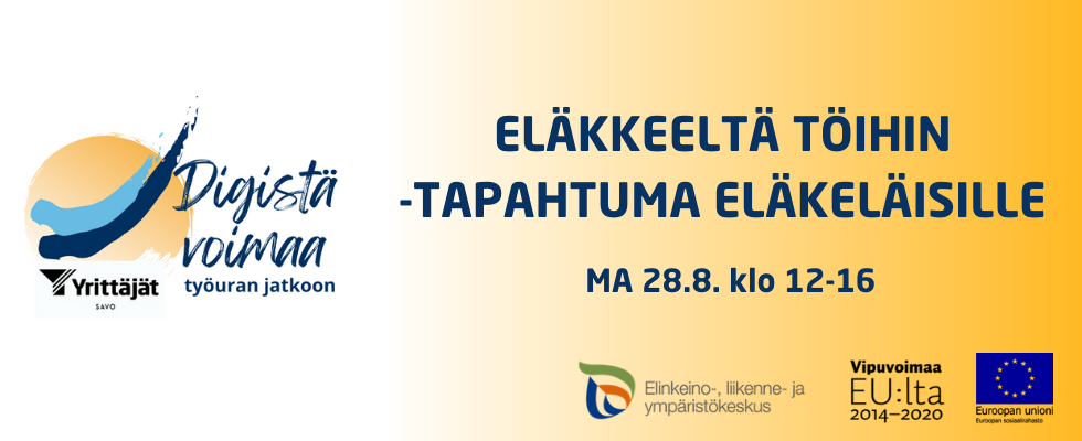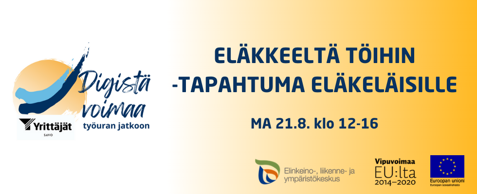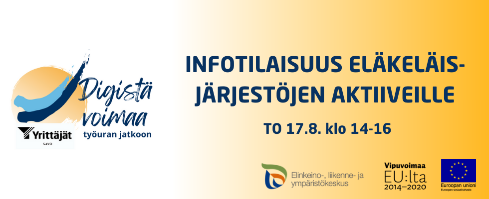 Eläkeläisjärjestöt ovat keskeinen yhteistyökumppani Savon Yrittäjille. Oletpa eläkeläisjärjestön toimija tai tavallinen rivijäsen, olet lämpimästi tervetullut kuulolle ja keskustelemaan, mitä eläkeläinen hyötyy Digistä voimaa työuran jatkoon-valmennuksesta. Miten eläkeläinen voi valmennuksen avulla johtaa omaa uraansa, lisätä elämäänsä merkityksellisyyttä ja vaurautta?