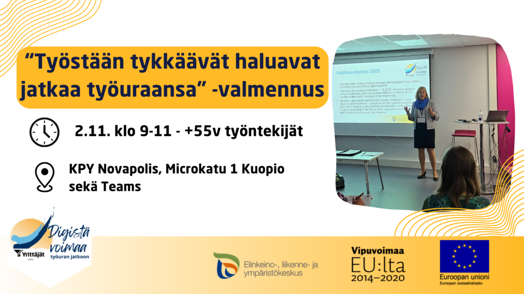 ”Digistä voimaa työuran jatkoon” -valmennukset käynnistyivät elokuussa. Seuraa koulutuskalenteriamme ja pääset mukaan toimintaan, joka murtaa työn ja eläkkeen rajapintaa.